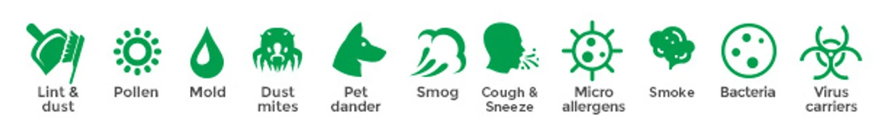 Particles Captured: Allergens, Virus Carriers, Smog, Most Smoke, Bacteria, Dust Mites, Dust, Lint, Mold Spores, Pet Dander, Pollen